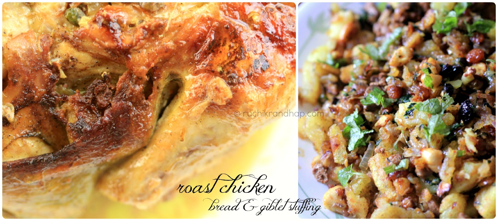 By the way, just in case you are as confused as I was as on time, in Mangalore, ‘chicken roast’ is a term popularly used to describe chicken kebabs – the large chunks of chicken marinated in red masala and then deep fried – popularly found on the wedding/roce function menu provided by caterers. However, roast chicken is a technique of roasting a whole chicken (usually with the skin on) with different spices and stuffed with different things like raisins, bread crumbs, mince meat or giblet (pronounced as ‘jib-let’)