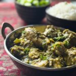 When the chicken is almost done, add the slit green chillies and simmer for 2 mins. Add the fried capsicum and the coriander leaves.